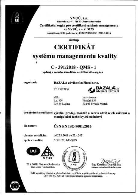 Společnost Bazala zdvihací zařízení s.r.o. se specializuje na výrobu, servis, repase, opravy a revize zdvihacích zařízení – jeřábové drážky, navijáky, elektrické kladkostroje, jeřáby (mostové, podvěsn...