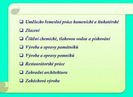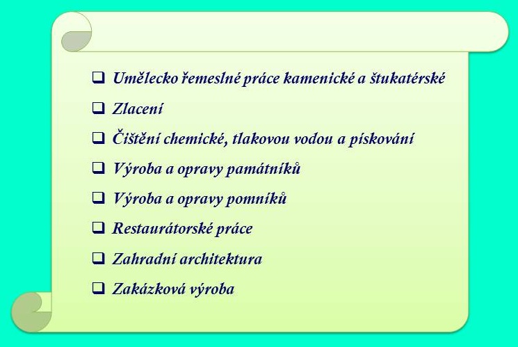 Služby: - kamenické a štukatérské práce, - opravy a výroba pomníků a náhrobků, - restaurování soch, zhotovování jejich kopií, - výroba parapetů, dlažeb, obkladů, stavba krbů.