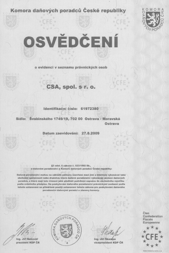 CSA, spol. s r.o. Ostrava.Auditorské ověřování: - roční účetní uzávěrky - účetní software - podnikatelské a neziskové subjekty.Sestavování daňových přiznání: - k dani z příjmu právnických a fyzických...